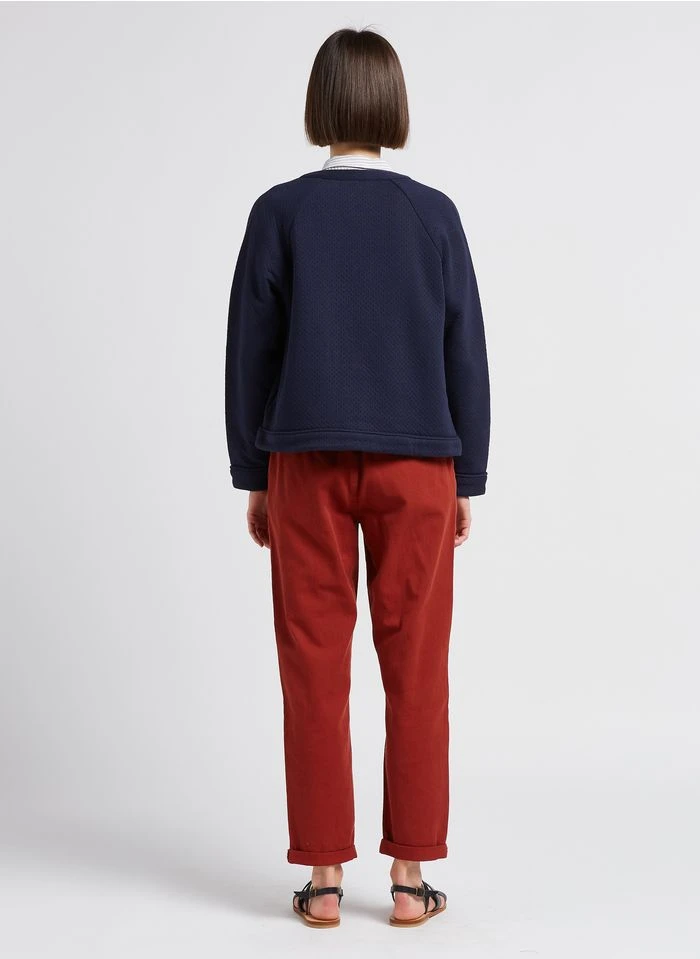Ce modèle est présenté avec Chemise col classique by SESSUN, Veste col rond en coton mélangé by EKYOG, Sandales plates en cuir by SESSUN